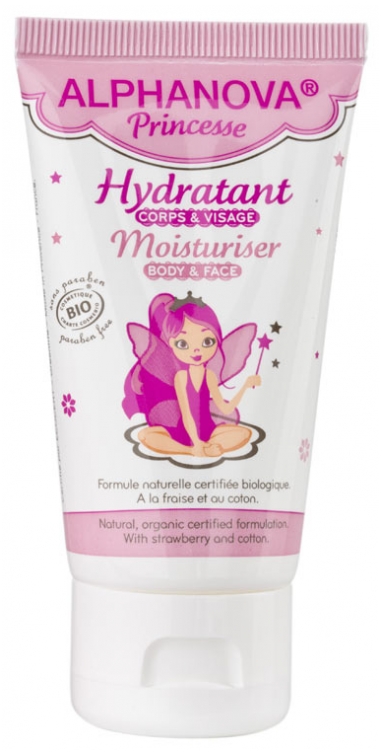 HYDRATANT à l’extrait de fraise bio, coton bio et jus d’aloe vera bio 100% naturel, 24% BIO ALPHANOVA Princesse Bio est une gamme de soin et d’hygiène pour les enfants. Les formules, très douces d’origine naturelle fabriquées en Provence ont été testées dermatologiquement. Afin de respecter l’environnement, nos produits utilisent des emballages recyclables, ils ne sont pas testés sur animaux et n’utilisent ni paraben, ni colorants ni substances chimiques nocives. Hydratant certifié biologique fabriqué en Provence pour le visage et le corps. Formule d’origine naturelle aux extraits de fraise bio et de coton bio apaisant. Soin enrichie en cold cream.