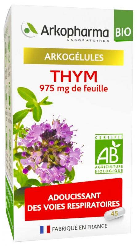 Arkogélules® Thym est un complément alimentaire spécialement formulé pour les personnes souhaitant maintenir un bon confort respiratoire.Grâce à son savoir-faire unique, Arkopharma restitue 100 % des actifs du Thym, qui agissent en synergie dans le plus grand respect de votre corps.