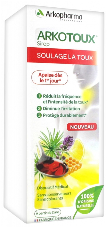 Glycérol issu d’huiles végétales - Miel - Arabinogalactanes de Mélèze (Larix sp.) - Extrait de feuille de Thym (Thymus vulgaris L.) - Oligofructose - Sirop d’agave - Eau - Jus concentré de citron - Gomme xanthane - Arôme naturel de fruits rouges.Grâce à l’apport de sucres à assimilation lente, issus du sirop d’agave et du miel, Arkotoux® Sirop a un faible index glycémique de 31.Chaque dose de 10 ml contient environ 3 grammes de sucres.