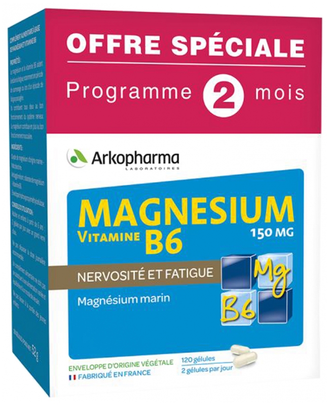 Oxyde de magnésium;Maltodextrine;Antiagglomérant : stéarate de magnésium;Vitamine B6;Colorants E171, E172.Information nutritionnelle moyenne Pour 1 gélulePour 2 gélules %VNR* %VNR*Vitamine B61 mg71%2 mg142 %Magnésium150 mg40%300 mg80%* Valeur Nutritionnelle de Référence