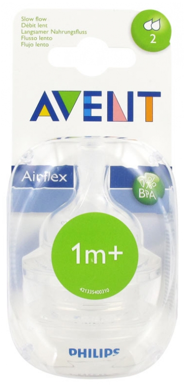 Les tétines à débit lent Avent Classic+ sont conseillées pour les bébés à partir de l’âge d’1 mois, mais peuvent être utilisées avant suivant la vitesse d’évolution de l’enfant. De forme anatomique, elles respectent parfaitement le développement de la bouche et de la mâchoire, et offrent une excellente expérience de tétée à bébé.Elles sont équipées du système exclusif Airflex, qui est une valve anti-colique permettant d’éviter que le nourrisson n’ingère trop d’air. La valve fléchit lorsque l’enfant tète, ce qui pousse l’air directement au fond du biberon plutôt que dans l’estomac de bébé, et évite dans le même temps les vides d’air. Au-delà du bénéfice purement physiologique, à savoir que la digestion du chérubin est facilitée, cela a également un impact direct sur son irritabilité, puisqu’il est ainsi moins enclin aux ballonnements et aux régurgitations, et est donc plus apaisé et calme.Le second avantage est que les tétines sont rainurées, ce qui favorise la succion et empêche surtout qu’elles ne s’écrasent pendant la tétée, permettant d’assurer un débit ininterrompu et d’éviter de générer de la frustration chez bébé. Leur débit lent est garanti par le fait qu’elles ne possèdent que deux trous.