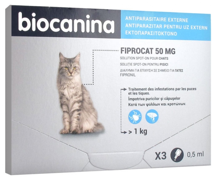 Voie d’administration et dosage :Pour application locale sur la peau uniquement. A usage externe exclusivement.Une pipette de 0,5 mL permet le traitement d’un chat, ce qui correspond à une dose minimale recommandée de 5 mg de fipronil par kg de poids corporel.L’intervalle minimum entre deux applications ne doit pas être inférieur à 4 semaines.