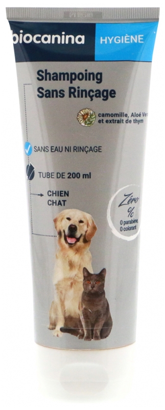 Le shampoing sans rinçage biocanina a une base lavante douce, sans Lauryl éther sulfate (LES), sans parabènes ni colorants. Il n’irrite pas la peau sensible des animaux et permet de l’hydrater et de la protéger à chaque shampoing.L’eau florale de camomille, l’Aloé Vera et l’extrait de thym apportent douceur et brillance au pelage.Produit d’hygiène pour animaux – Usage externe – Ne pas faire avaler.