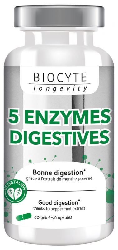 Valeur nutritionnelles par dose journalière recommandée (2 gélules) : Extrait de feuille de menthe poivrée Mentha x piperita L. (maltodextrine) 334 mgAlpha-amylase30,06 mgLactase15,03 mgProtéase1,67 mgLipase1,67 mgCellulase0,334 mg