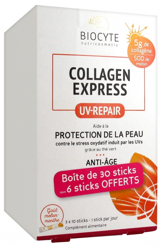 Le pack Collagen Express UV-REPAIR®, avec de 5 grammes de collagène par jour (1 sticks), apporte la dose essentielle pour assurer la densité et la fermeté de la peau. Combiné au complexe Hélioprotec®, Collagen Express UV-REPAIR permet également une protection efficace contre les dommages des rayons UVs et l’apparition des taches brunes.Le Pack Collagen Express UV-REPAIR® est composé de 30 sticks de collagène, dosé à 5 grammes par jour (1 Sticks). Il vous offre une cure express de collagène associé au complexe anti-oxydant Hélioprotect®. L’association idéale pour une peau plus ferme, plus jeune et renforcée contre les dommages de l’exposition solaire !En plus du phénomène de vieillissement naturel, la peau subit perpétuellement les effets néfastes de l’environnement dont le premier est l’exposition solaire. Les rayons UV accélèrent l’endommagement des fibres de collagène, brique essentielle de la peau, et par conséquent l’apparition des rides et tâches brunes. C’est ce que l’on appelle le phénomène de photo-vieillissement.L’association du Collagène et du Complexe Hélioprotect® (à base de SOD, antioxydant issu du melon) permet de réactiver la production naturelle de collagène mais également de diminuer l’incidence des dommages causés par les rayons UVs sur la peau.La peau est alors protégée et plus résistante, les rides et les taches brunes sont réduites. Le capital jeunesse est préservé et les signes de vieillissement sont estompés.
