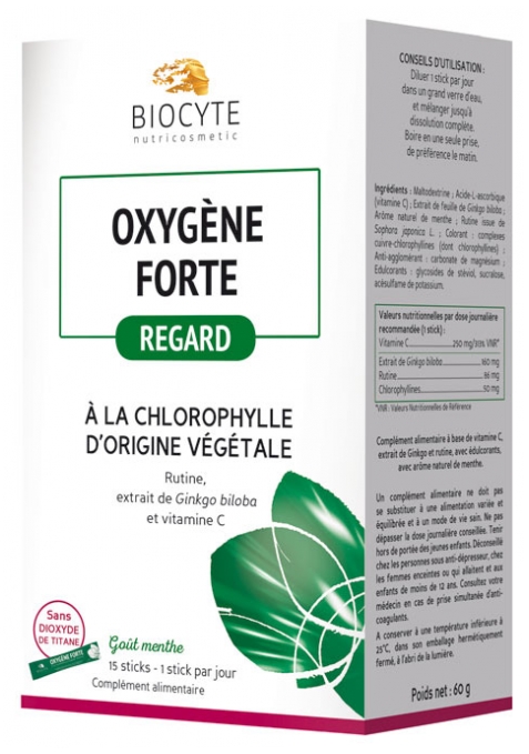 Ingrédients (pour 1 stick) : Maltodextrine ; Acide-L-ascorbique (vitamine C) 250 mg/313% VNR* ; Extrait de feuille de Ginkgo biloba (sirop de glucose) 160 mg ; Arôme naturel de menthe ; Rutine issue de Sophora japonica L. 86 mg ; Colorant : complexes cuivre-chlorophyllines (dont chlorophyllines 50 mg) ; Anti-agglomérant : carbonate de magnésium ; Edulcorants : glycosides de stéviol, sucralose et acésulfame de potassium.