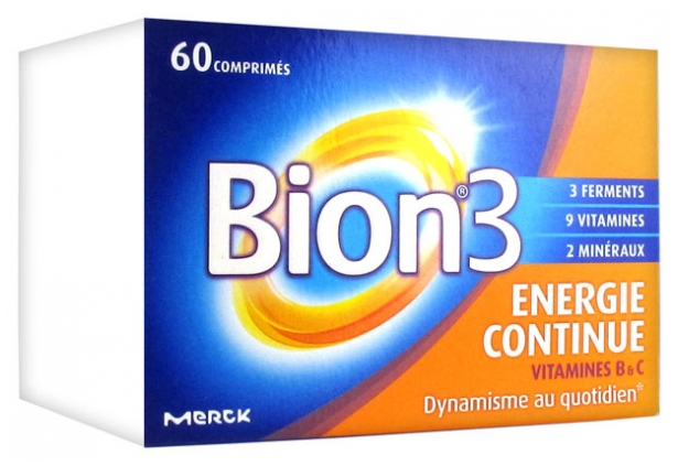 Bion 3 Energie Continue est un complément alimentaire formulé à base de 11 vitamines, 3 ferments Tri-Bion brevetés et 3 minéraux.Les vitamines B12 et C contribuent à un métabolisme énergétique normal. Le fer et les 3 minéraux aident à réduire la fatigue. Enfin, les 3 ferments tri-bion aident à atteindre la flore intestinale.La technologie de fabrication unique du Bion 3 Energie Continue permet la libération prolongée de ses ingrédients, en particulier des vitamines de l’énergie dans l’organisme. Pendant 6 heures, ce complément alimentaire libère des vitamines B1, B2, B3, B5, B6 et C.