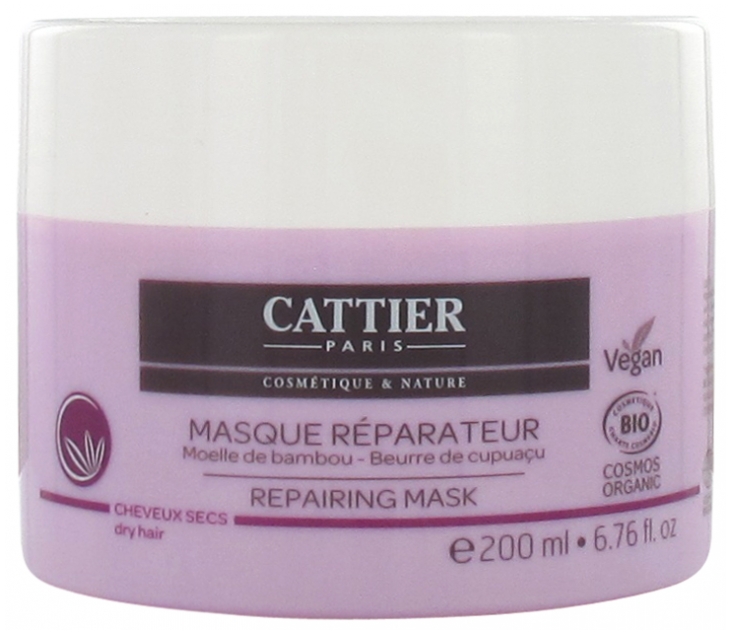 Le Masque Réparateur Cattier, à la texture riche et fondante, nourrit et répare les pointes sèches sans alourdir la chevelure. Sa formule, enrichie en beurre de cupuaçu et moelle de bambou, protège et gaine la fibre capillaire pour un démêlage facile. Restructurant, il prévient la formation des fourches. Plus forts, les cheveux sont soyeux, souples, doux et brillants.