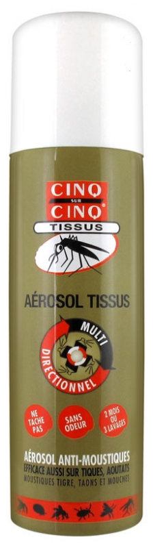 Aérosol à usage biocide à base de perméthrine et de géraniol, qui tue les moustiques.Cinq sur Cinq tue aussi les tiques et les taons.Efficace même après 3 lavages.Efficace 2 mois après imprégnation.