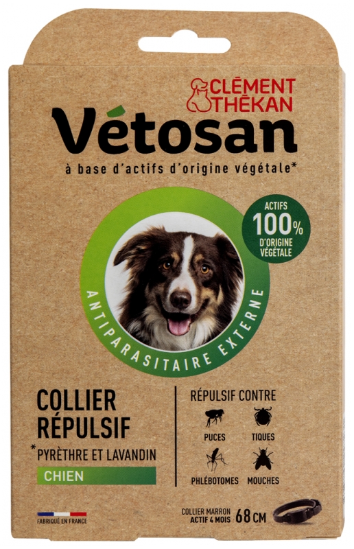 Biocide – Action répulsive contre les puces, les tiques, les phlébotomes et les mouches – À base de lavandin et de pyrèthre.Le collier répulsif Vétosan a été spécialement conçu pour repousser efficacement les principaux parasites externes du chien, tels que les puces et les tiques, grâce à une association de 2 actifs d’origine végétale : l’huile essentielle de lavandin et l’extrait de pyrèthre, connus pour leur action répulsive sur les parasites. Le collier répulsif Vétosan est également efficace contre les phlébotomes et les mouches. Il est enrichi en acides gras essentiels Omega 3 et 6 connus pour renforcer la brillance et le toucher soyeux du poil.