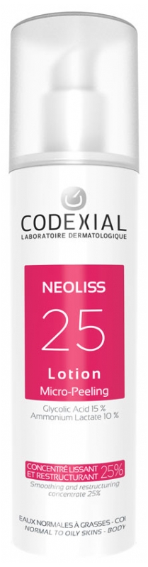 Neoliss 25 Lotion est destinée aux peaux normales à grasses en cas d’imperfections cutanées et de rugosités de l’épiderme. Grâce à sa texture lotion-gel fluide non grasse, Neoliss 25 Lotion est adaptée à toutes les zones corporelles : corps, zones pileuses et cuir chevelu.Neoliss 25 Lotion est un soin fluide sans parfum, aux propriétés lissantes et restructurantes grâce à sa très forte concentration en agents exfoliants (acide glycolique et lactate d’ammonium).Neoliss 25 Lotion exfolie les cellules superficielles et affine le grain de peau.