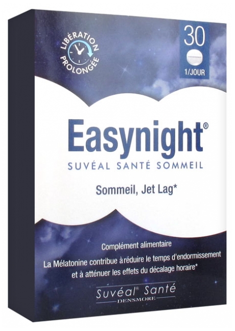 Easynight remplace SUVEAL SANTE Sommeil cip 5172929  Complément alimentaire à base de Mélatonine, Magnésium, Zinc et Vitamine B6.La Mélatonine est une substance naturellement sécrétée par notre cerveau la nuit. Elle contribue à réduire le temps d’endormissement et aide à atténuer les effets du décalage horaire.Le Magnésium et la Vitamine B6 contribuent à réduire la fatigue, au fonctionnement normal du système nerveux et à des fonctions psychologiques normales.