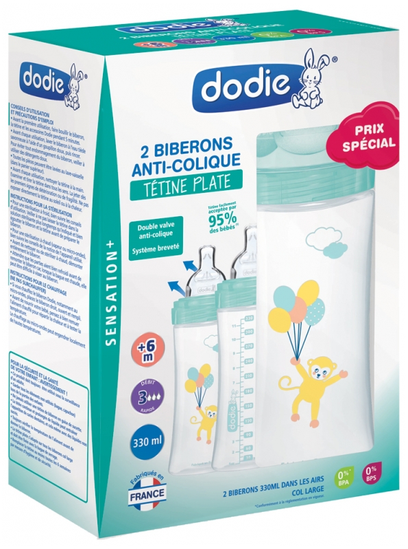 Kit de deux biberons anti-coliques tétines plates décor AirDeux biberons Sensation+ 330mL équipés de tétines plates débit rapideSystème anti-colique intégré à la tétine grâce à une double valve brevetéeTétine plate imitant la forme aplatie du sein pendant la tétée : favorise le passage du sein au biberon , acceptée facilement par 95% des bébés (test réalisé par l’IDM en octobre 2014 auprès de 20 mamans d’enfants âgés de 0 à 12 mois)Biberon triangulaire, facile à prendre en main et garanti sans bisphénol A ni S (conformément à la réglementation en vigueur)