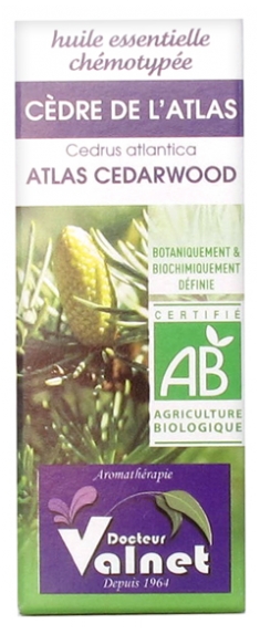 Docteur Valnet Grand arbre majestueux poussant dans le massif de l’Atlas au Maroc et en Algérie entre 1200 et 3000 m, le cèdre de l’Atlas donne un bois très résistant. L’huile essentielle extraite des copeaux de bois dégage un parfum riche, boisé, aux effets bienfaisants sur le plan émotionnel.