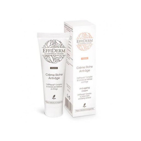 La crème Riche Anti-âge Effiderm® est l’alliée des peaux matures, elle augmente leur vitalité, leur résistance et les stimule dans leur régénération. Le beurre de Karité et l’huile d’Amande douce préserve la peau du dessèchement et de la déshydratation. L’acide hyaluronique agit en synergie avec l’extrait de Mélisse et d’Orge riche en puissants composés antioxydants pour lutter activement contre les effets du temps.Le CellRepulp® Complex, un complexe anti-âge exclusif :Laisse la peau douce et hydratée, Tonifie et raffermit les tissus de soutien, pour une peau plus jeune, Protège la peau des agressions extérieures, notamment de la pollution, Illumine le teint.Les rides s’atténuent, les contours du visage se raffermissent, le grain de peau s’affine.