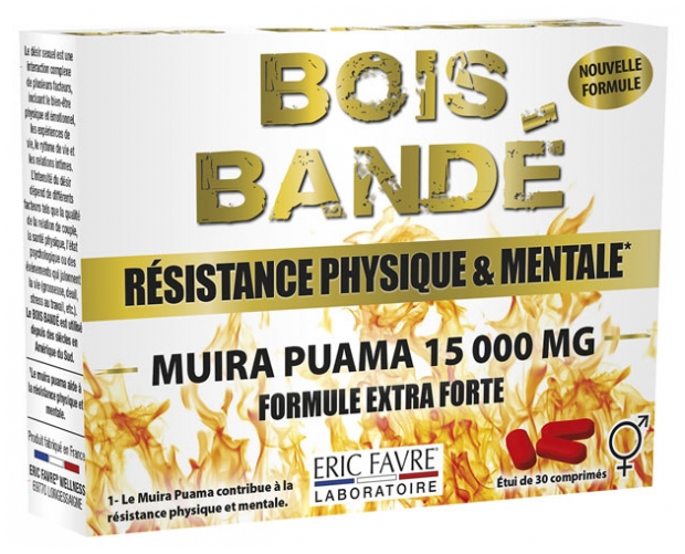 Agent de charge : sorbitol ; poudre de Muira puama ; agents d’enrobage (épaississant : hydroxypropylmethyl cellulose ; agent de charge : cellulose microcristalline ; émulsifiant : esters acétiques de mono et diglycérides d’acides gras ; colorants : rouge carmin, dioxyde de titane, paprika) (soja) ; antiagglomérants : stéarate de magnésium, silice [nano].