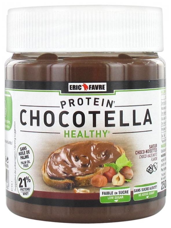 Edulcorant : maltitol ; huiles végétales (colza, karité, coco) ; protéines de lactosérum concentrées (lait) ; noisettes (11%) ; poudre de cacao maigre ; émulsifiant: lecithine de soja ; arôme.Peut contenir des traces d’autres fruits à coque.Apports nutritionnelssss Pour 100gPour 15gEnergie2173 Kj/ 524 Kcal (26% AR*)326 Kj/ 78Kcal (3.9% AR*)Matières grassesDont saturées39g (55.7% AR*)9g (45% AR*)5.9g (8.4% AR*)1.4g (6.8% AR*)GlucidesDont sucres33g (12.7% AR*)2.1g (2.3% AR*)5g (1.9% AR*)0.3g (0.3% AR*)Protéines21g (42% AR*)3.1g (6.3% AR*)Sel0.1g (1.7% AR*)0.01g (0.3% AR*)*Apports de référence pour un adulte type (8400kJ/2000Kcal)