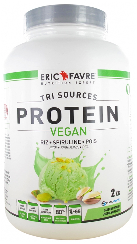 Isolate de proteine de pois (90,5%), arome pistache, proteine de riz (3%), ModCarb™ (son d’avoine, quinoa d’origine biologique, amarante d’origine biologique, sarrasin d’origine biologique, millet d’origine biologique)(2%), spiruline titree en cholorophylle (spirulina platensis) (1%), edulcorant : thaumatine, chlorure de sodium.Apports nutritionnelsValeurs nutritionnelles pour une dose de 30g : Valeurs énergétiques : 107 kcal (454 kJ) (5.4%) Protéines : 24.3g (48.7%AR) Glucides : 1.5g (0.6%AR) dont sucres : 0g (0%AR) Matières grasses : 1.2g (1.7%AR) dont acides gras saturés : 0.2g (1%AR) Fibres : 0.8g Sel : 1g (17%AR) Spiruline : 333 mg dont chlorophylle : 3 mg%AR= % des apports de référence