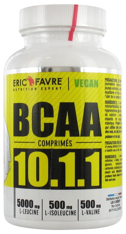 L-LEUCINE ; L-ISOLEUCINE ; L-VALINE ; AGENT DE CHARGE : CELLULOSE MICROCRISTALLINE ; AGENTS LUBRIFIANTS : HYPROMELLOSE, DIOXYDE DE TITANE, TALC, HYDROXYPROPYLMÉTHYL CELLULOSE, MIGLOL (TRIGLYCÉRIDES À CHAINES MOYENNES) ; ANTIAGGLOMÉRANTS : STÉARATE DE MAGNÉSIUM, SILICE [NANO].Apports pour 6 comprimés : - L-leucine... 5000 mg - L-isoleucine...500 mg - L-valine...500 mg