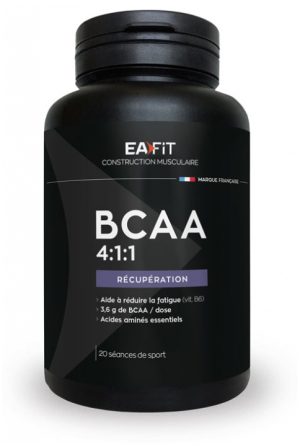 BCAA 2:1:1 (leucine, isoleucine, valine) ; agent de charge : cellulose microcristalline; stabilisant : croscarmellose sodique: anti-agglomérant : stéarate de magnésiumApports nutritionnelsPour 4 comprimés :L-leucine 1600 mgL-Isoleucine 800 mgL-Valine 800 mg