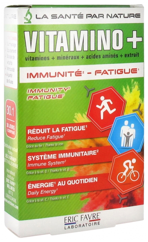 Remplace 3525722019248 Eric Favre Vitamines et Minéraux 30 comprimés_______________________________________________________________________________________VITAMINO+ est composé de 12 vitamines, 9 minéraux, 3 acides aminés et pipérine.Ce complexe tonifiant sera apprécié pour ces nombreuses propriétés et par toute la famille (dès 6ns) :Surmenage1Épuisement1Baisse de vitalité1Immunité21Les vitamines B2, B6, B12, C et le fer contribuent à réduire la fatigue.2Les vitamines A, B6, B9, B12, C, D, le fer et le zinc contribuent au fonctionnement normal du système immunitaire.