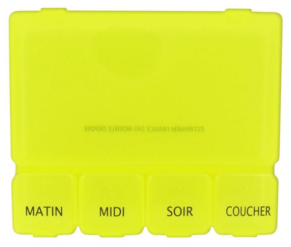 Estipharm Pilulier Journalier - Couleurs : Bleu Jaune Vert ou Violet.Le pilulier journalier Estipharm est doté de 5 compartiments : un grand compartiment, et 4 petits compartiments : matin, midi, soir, coucher (taille : 3 x 3 x 3 cm).Taille : 10,50 x 12 x 2,50 cm.