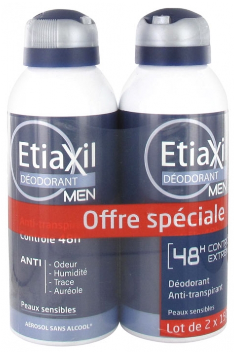 Le déodorant Etiaxil pour homme est un anti transpirant en aérosol qui offre un contrôle et une fraîcheur pendant 48 heures. Il permet de réguler la transpiration en resserrant légèrement les pores de la peau afin de réduire la sécrétion des glandes sudoripares, responsables de la sueur dès le premier coup de chaud. Il n’obstrue pas pour autant complètement ce phénomène fondamental au bon équilibre de l’organisme. Il répond parfaitement aux besoins des hommes dont la plus forte corpulence générale implique généralement une transpiration plus importante.Grâce à ses agents antibactériens, cet anti transpirant Etiaxil Contrôle 48h pour homme neutralise l’action des bactéries qui en dégradant la sueur occasionnent les mauvaises odeurs. Il ne laisse pas non plus de taches jaunes ou blanches sur les vêtements offrant une hygiène irréprochable. Vos aisselles sont aussi fraîches et sèches du matin jusqu’au lendemain.Sans alcool, ce déodorant anti transpirant Etiaxil est spécialement formulé pour respecter les peaux les plus sensibles. Il a été contrôlé sous contrôle dermatologique afin d’offrir une brume totalement hypoallergénique. Son léger parfum boisé vous accompagne discrètement dans tous vos déplacements et voile idéalement les petites odeurs qui surviennent en cas d’activité physique intense. Son format compact se glisse d’ailleurs aisément dans un sac de sport.