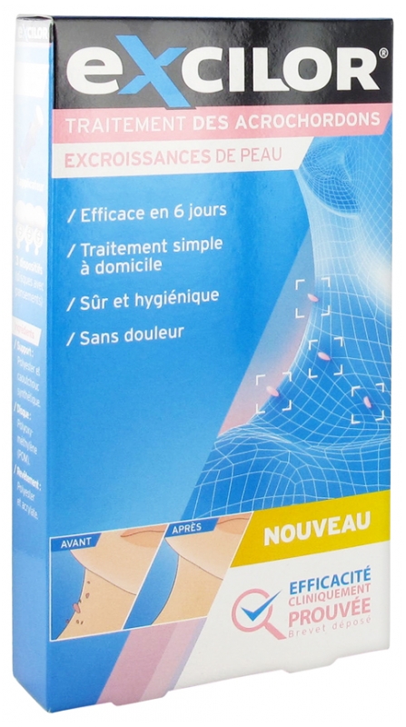 Excilor Traitement des Acrochordons Excroissances de Peau est un dispositif pour un traitement simple à domicile, sûr et hygiénique et sans douleur des acrochordons, efficace en 6 jours.Les acrochordons sont de petites excroissances de peau souple, très communes et bénignes. Ils ont tendance à apparaître sur le cou, les aisselles et sous les seins. Les acrochordons peuvent être irritants, gênants, embarrassants et inesthétiques.