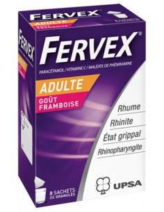 FERVEX ADULTES FRAMBOISE, 8 sachets est un médicament utilisant plusieurs principes actifs, recommandé dans le traitement des douleurs modérées à intenses.