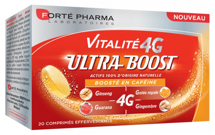correcteurs d’acidité (acide citrique, carbonate de sodium), agent de charge (sorbitol), extrait de ginseng (Panax ginseng CA Meyer) (100 mg), arôme orange, amidon de maïs, caféine d’origine naturelle, extrait d’acérola titré en vitamine C (Malpighia glabra L.) (48 mg), gelée royale lyophilisée (42 mg équivalent à 126 mg de gelée royale fraîche), extrait de guarana titré en caféine (Paulinia cupana Kunth) (33,5 mg), extrait de gingembre (Zingiber officinale Roscoe) (26,3 mg), colorant (bêta-carotène), édulcorants (sucralose, glycosides de stéviol, cyclamate de sodium, acésulfame de potassium, saccharinate de sodium, néohespéridine DC), anti-moussant (diméthylpolysiloxane),antiagglomérant (dioxyde de silicium).Analyse nutritionnelle pour 1 comprimé:extrait de ginseng (Panax ginseng CA Meyer) (100 mg), extrait d’acérola titré en vitamine C (Malpighia glabra L.) (48 mg), gelée royale lyophilisée (42 mg équivalent à 126 mg de gelée royale fraîche), extrait de guarana titré en caféine (Paulinia cupana Kunth) (33,5 mg),extrait de gingembre (Zingiber officinale Roscoe) (26,3 mg),Vitamine C 12 mg soit 15% VNR