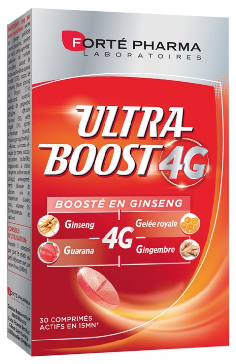 agents de charge (cellulose microcristalline, amidon de maïs, carboxyméthyl-cellulose de sodium réticulée), extrait de guarana (Paulinia cupana Kunth) (230), extrait de ginseng (Panax ginsengCAMeyer)(135), édulcorant(sorbitol),extrait de gingembre(ZingiberofficinaleRoscoe) (50), gelée royale (34), agents d’enrobage [isomalt, hydroxypropylméthylcellulose, colorants (dioxyde de titane, roucou, curcumine, cochenille), triglycérides à chaîne moyenne, arôme naturel orange], antiagglomérants (dioxyde desilicium,selsdemagnésiumd’acidesgras), vitamineB5 (D-Pantothénate de calcium).Sans gélatine. Analyse nutritionnelle pour 1 comprimé:extrait de guarana (Paulinia cupana Kunth) (230mg), extrait de ginseng (Panax ginsengCAMeyer)(135mg), extrait de gingembre(ZingiberofficinaleRoscoe) (50mg), gelée royale (34mg)vitamineB5 (D-Pantothénate de calcium) 0,9mg soit 15% VNR**VNR: valeurs nutritionnelles de référence