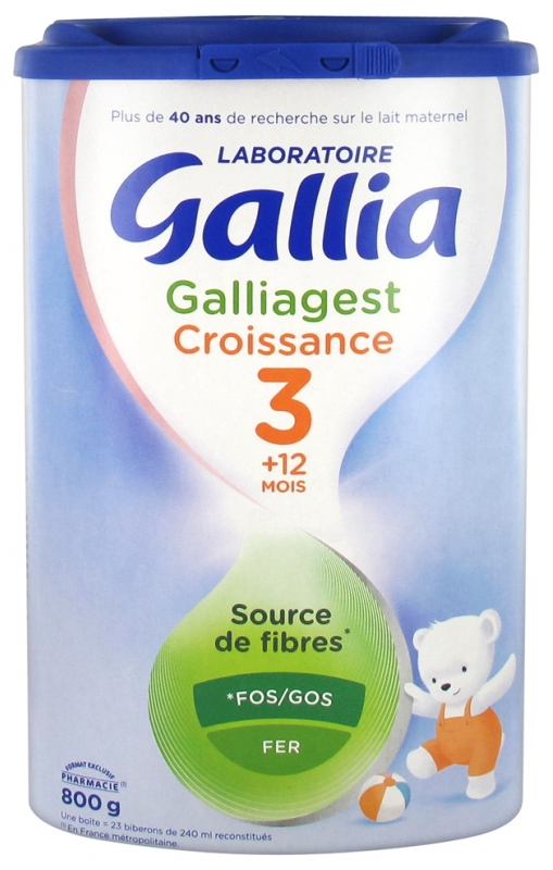 LAIT écrémé (LAIT) - Lactose (LAIT) - Lactosérum (lactosérum déminéralisé, protéines de lactosérum concentrées) (LAIT) - Sirop de galacto-oligosaccharides (LAIT) - Maltodextrines - Huiles végétales (palme, tournesol, colza) - Poudre de galacto-oligosaccharides (LAIT) - Fructo-oligosaccharides - Emulsifiant : lécithine de SOJA (SOJA) - Taurine - Chlorure de choline - Antioxydant : extrait riche en tocophérols - Minéraux (phosphate de calcium, carbonate de calcium, citrates de potassium et de sodium, chlorures de magnésium et de potassium, sulfates de fer, de zinc, de cuivre et de manganèse, iodure de potassium, sélénite de sodium) - Vitamines (A, B1, B2, B3, B5, B6, B8, B9, B12, C, D3, E, K1).