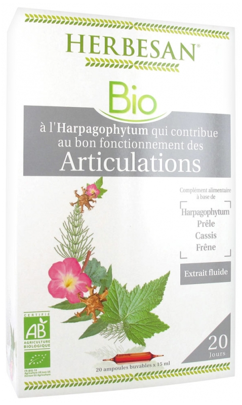 A l’Harpagophytum qui contribue au bon fonctionnement des Articulations. La formulation d’Herbesan ® Phyto à l’ Harpagophytum associe 4 plantes :L’ Harpagophytum.La PrêleLe CassisLe FrêneLe plus de cette formule ?Une composition de 1275 mg** de plantes. Avec de l’ Harpagophytum et du Cassis qui contribuent au bon fonctionnement des articulations, associés à de la Prêle qui contribue à l’élasticité du cartilage articulaire et au Frêne qui complète cette formule.Sans alcool, sans colorant ***, sans conservateur.** Equivalent en plantes sèches. ***Conformément à la réglementation en vigueur sur le mode de production biologique.