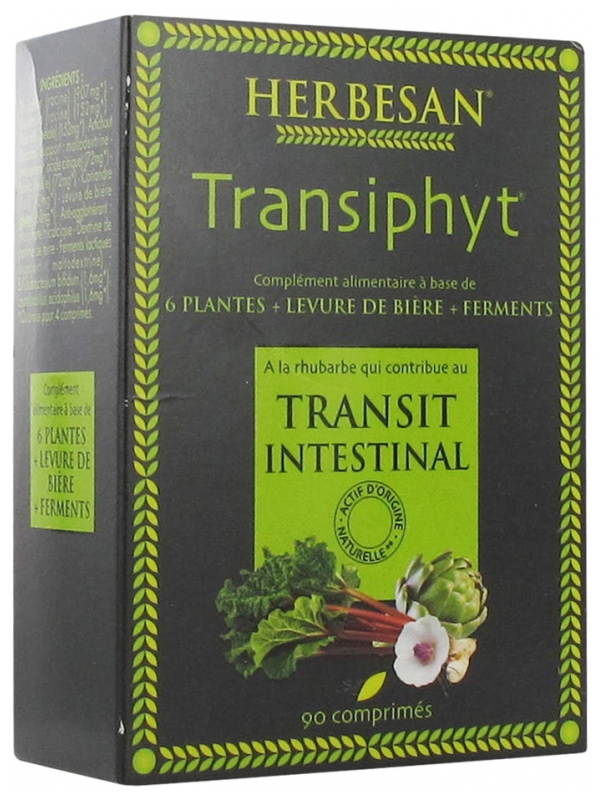 La formulation exceptionnelle de Transiphyt combine notamment 6 plantes spécifiques:-La Rhubarbe est reconnue pour favoriser le transit intestinal. 4 comprimés de Transiphyt apportent en moyenne quotidiennement 21mg de dérivés anthracéniques (substances actives) issus de la Rhubarbe et exprimés en rhéine. -La Rose pâle aide à maintenir un bon péristaltisme intestinal -L’Artichaut, la Coriandre, la Guimauve et le Basilic complètent le Phytocomplexe