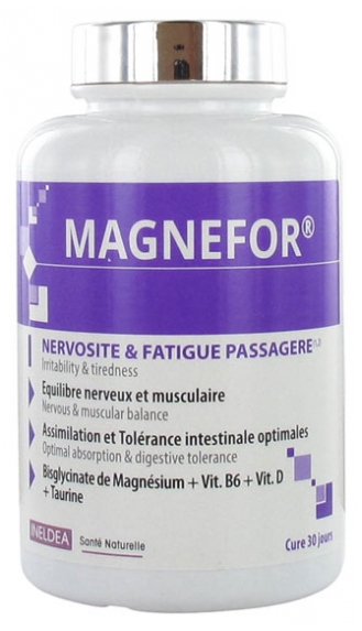 Equilibre nerveux et musculaire Assimilation et tolérance intestinale optimales : 100% Bisglycinate de Magnésium Efficacité maximale grâce aux actifs à effet synergique : Taurine, Vitamines B6 et D Idéal en cas de nervosité, fatigue passagère et crampesLe Magnésium améliore l’équilibre nerveux, psychique et émotionnel. Il est également essentiel à la contraction musculaire (notamment cardiaque).Il joue un rôle fondamental dans plus de 300 réactions métaboliques de l’organisme.Malheureusement, malgré son importance dans le bon fonctionnement de l’organisme :75% de la population souffre d’un déficit en MagnésiumMême avec une alimentation équilibrée, les apports recommandés sont rarement atteints1 pouvant entrainer une sensation de fatigue, une augmentation de la nervosité, des crampes ou des tremblements musculaires (paupière qui saute).Face à ces signes, une complémentation en Magnésium peut être utile mais attention à bien regarder la nature du Magnésium utilisé car tous les sels de magnésium ne se valent pas.Certains sels de dernière génération comme le Bisglycinate de Magnésium sont particulièrement bien assimilés et tolérés au niveau intestinal.MAGNEFOR® a ainsi été formulé à partir d’un Magnésium sous forme Bisglycinate.De plus, sa concentration élevée en Magnésium (300 mg par dose journalière) permet de couvrir les besoins même en cas de gros déficit.MAGNEFOR® contient aussi de la vitamine B6, de la vitamine D et de la Taurine afin de compléter l’action du Magnésium :La vitamine B6 contribue au fonctionnement normal du système nerveux et aide également à réduire la fatigue. La vitamine D associée au Magnésium contribue par ailleurs à une fonction musculaire normale.