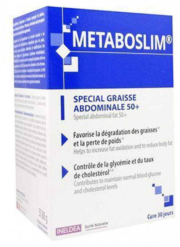 Ligne et santé après 50 ans !Etui de 90 gélules végétalesSPECIAL GRAISSE ABDOMINALE 50+Favorise la dégradation des graisses et la perte de poids Contrôle de la glycémie et du taux de cholestérol Actif à l’efficacité cliniquement prouvéeLe plus produit : Triple action. Un seul produit pour agir sur les différents paramètres du syndrome métabolique. Permet également une action préventive. L’arrivée de la cinquantaine est souvent associée à un ralentissement des métabolismes engendrant prise de poids, de masse grasse localisée (abdomen) et modifications des bilans lipidique et glycémique.La réunion de ces symptômes porte un nom : Syndrome métabolique (ouSyndrome X).Il concerne jusqu’à 20% de la population adulte.Au-delà des considérations esthétiques, la prise en charge de ces dérèglementspermet d’agir en prévention de troubles cardio-vasculaires et/ou diabète detype 2 dont les conséquences peuvent être multiples.Les Laboratoires INELDEA, experts en produits de santé naturelle, ont mis en oeuvre tout leur savoir-faire dans la formulation de METABOSLIM®. METABOSLIM® est composé d’un actif breveté 100% d’origine naturelle à l’efficacité démontrée, le METABOSLIM Complex®, ainsi que d’une association de vitamines ||amp; chrome permettant une triple action :Action 1 - Favoriser la dégradation des graisses et la perte de poidsAction 2 et 3 - Contrôler les taux de sucre, triglycérides et cholestérolLe METABOSLIM® Complex est un extrait breveté de plantes titré en polyphénols et EGCG, à l’efficacité cliniquement prouvée* :Action sur les bilans lipidique et glycémiqueAugmentation du HDL (“bon cholestérol”) de + 8% Baisse du LDL (“mauvais cholestérol”) de - 10 % Baisse des Triglycérides totaux de - 14 % Baisse du marqueur de la Glycémie de - 14 %Action sur le surpoids et le ventrePerte de poids jusqu’à -6 kg Réduction du Tour de taille jusqu’à -2 cm Perte de poids à 76 % sous forme de perte de masse grasse localisée au niveau du troncMETABOSLIM®, un geste simple pour entretenir sa ligne et sa santé dès 50 ans !* Etude clinique randomisée en double aveugle contre placebo 17 sujets pendant 12 semaines (IMC 30-34.9 mg/m2 ; 8 femmes et 9 hommes) sur la base de 900 mg / j de Métaboslim®complex.