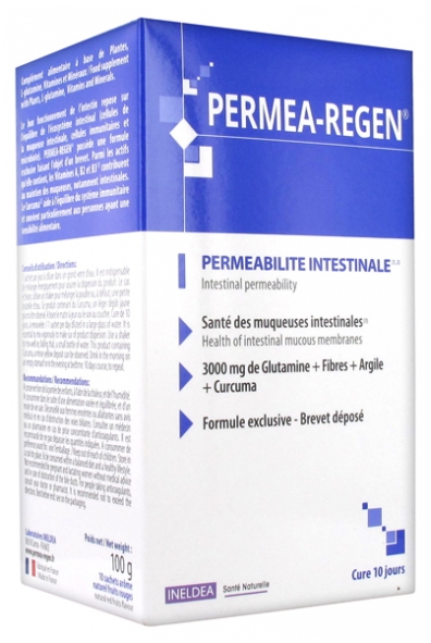 Ingrédients : Fibres d’Acacia - Fibregum™, L-glutamine, gamma-oryzanols extraits de son de Riz, Argile verte, extrait de rhizome de Curcuma titré en curcumine, Spiruline, arôme naturel de cassis, arôme naturel de fraise, citrate de Zinc, L-glutathion, Vitamines A-D-E-C-B1-B2-B3-B5-B6-B12 et B9 (acide 6S-5-méthyltétrahydrofolique sous forme de sel de glucosamine).Informations nutritionnelle moyennes par sachet (10 g) :Fibres d’acacia / Acacia fibers - Fibregum™...................................4280 mgL-glutamine.......................................................................................3000 mgGamma-oryzanols extraits de son de riz...............970 mgArgile verte.....................................................................500 mgExtrait de Curcuma (Curcuma longa).................300 mgDont Curcumine..............................................................240 mgSpiruline (Spirulina platensis)..........................................150 mgL-glutathion........................................................................................5 mgVitamine A........................................................................400 ?g (50% AR)Vitamine D.........................................................................2.5 ?g (50% AR)Vitamine E.........................................................................6.0 mg (50% AR)VitamineC.........................................................................40 mg (50% AR)VitamineB1....................................................................0.55 mg (50% AR)VitamineB2....................................................................0.70 mg (50% AR)VitamineB3......................................................................8.0 mg (50% AR)VitamineB5......................................................................3.0 mg (50% AR)Vitamine B6....................................................................0.70 mg (50% AR)VitamineB9 (sel de glucosamine.........100 ?g (50% AR)VitamineB12...................................................................1.25 ?g (50% AR)Zinc ......................................................................................5.0 mg (50% AR)AR : Apports de Référence