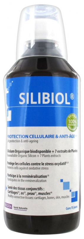 Eau purifiée, acide orthosilicique stabilisé à la choline, sirop de glucose fructose; extraits de prêle, bambou tabashir, jeunes pousses de bambou, ortie, curcuma, saule, cassis et bouleau, naturellement riches en silicium organique (supports: maltodextrine, gomme arabique); arômes naturels de framboise et citron (support : propylene glycol); conservateurs : sorbate de potassium, benzoate de sodium, sodium benzoate; correcteur d’acidité : acide citrique.Sans gluten – Sans allergène – Sans ingrédients d’origine animale – Sans OGMInformations nutritionnelles moyennes pour 1/2 bouchon doseur (30ml) : Acide orthosilicique stabilisé par de la choline** : 2 460 mg Extrait de Prêle** (Equisetum arvense) : 358 mg (*eq. 358 mg) Exsudat de Bambou** (Bambusa arundinacea) : 50 mg Extrait de jeunes pousses de Bambou (Bambusa arundinacea) : 50 mg Extrait d’Ortie – feuilles (Urtica dioïca) : 50 mg (*eq. 50 mg) Extrait de racine de Curcuma (Curcuma longa) : 50 mg (*eq. 50 mg) Extrait d’écorce de Saule blanc (Salix alba) : 50 mg (*eq. 50 mg) Extrait de feuilles de Cassis (Ribes nigrum) : 50 mg (*eq. 50 mg) Extrait d’écorce de Bouleau blanc (Betula alba) : 50 mg (*eq. 50 mg) ** Total Silicium : 54,7 mg*Equivalent Plantes Sèches