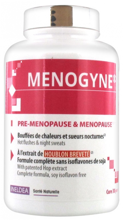 Pré-ménopause et ménopause.Complément alimentaire à base d’extraits de Lin, Houblon, Sauge et Vitamine B9. -Participer à l’activité hormonale chez la femme, spécialement durant la ménopause grâce à l’extrait de Lin-Contribuer à faire face aux effets de la ménopause tels que bouffées de chaleur, sueurs nocturnes grâce à l’extrait de Houblon Le + produit :Menogyne est sans isoflavones de soja. Intervenant en moyenne à l’âge de 50 ans, la ménopause peut être mal vécue à cause des désagréments qu’elle occasionne et notamment les bouffées de chaleur (environ 3 femmes sur 4 sont concernées). La ménopause est marquée par la baisse de la production des hormones féminines, les œstrogènes. C’est cette baisse qui perturbe les métabolismes et entraîne de nombreux désagréments. L’extrait de Lin participe à l’activité hormonale chez la femme, spécialement durant la ménopause.Lifenol est un extrait de Houblon capable d’atténuer les inconforts associés à ma menopause, et notamment les bouffées de chaleur.L’extrait de Sauge favorise l’équilibre hormonal de la femme et soutient le bien-être féminin. Composition:Agent de charge: maltodextrine, gélule végétale (HPMC, colorants : complexe cuivrique des chlorophyllines), extrait de graines de Lin titré en lignanes, extrait breveté de cônes de Houblon titré en 8-prénylnaringénine- Lifenol, extrait de feuilles de Sauge (support : gomme arabique), vitamine B9, émulsifiant : stéarate de magnésium, anti-agglomérant : silice.Sans gluten – Sans allergène – Sans ingrédients d’origine animale - Sans OGMInformations nutritionnelles moyennes pour 3 gélules:Extrait de Lin (Linum usitatissimum) : 250mg (*eq. 3750 mg)Dont Lignanes : 50 mgExtrait de Houblon (Humulus lupulus) Lifénol : 120mg (*eq. 1800mg)Dont 8-prénylnaringénine: 200 µgExtrait de Sauge (Salvia officinalis) : 105mg (*eq. 525 mg)Vitamine B9 : 200µg (100% AR)AR : Apports de référence* Equivalent Plantes sèches