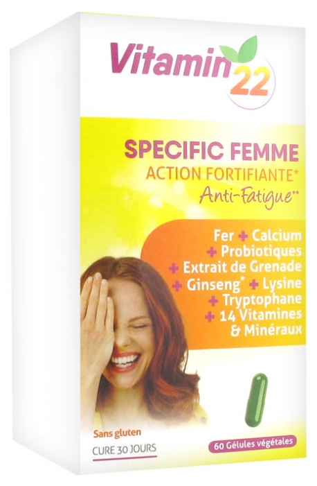 carbonate de calcium (support : amidon de maïs), gélule végétale (HPMC, colorants : dioxyde de titane, jaune orangé S), oxyde de magnésium, acide ascorbique (vitamine C), lactate de fer, extrait de grenade titré en acide ellagique (supports : maltodextrine, silice), poudre de racine de ginseng rouge, L-lysine, L-tryptophane, vitamine Eacétate, ferments lactiques microencapsulés (Lactobacillus rhamnosus, Lactobacillus acidophilus ; supports : amidon de maïs, tréhalose, maltodextrine, poudre de lait, lactosérum, lactose, gomme xanthane), bétacarotène (supports : alginate, gomme arabique, amidon de pois), acide folique (vitamine B9, support : maltodextrine), chlorure de chrome (support : maltodextrine), émulsifiant : stéarate de magnésium, citrate de manganèse, borate de sodium, anti-agglomérant : silice, vitamine B12, chlorhydrate de pyridoxine (vitamine B6), vitamine D3 (supports : amidon modifié, maltodextrine, huile de colza, antioxydants : acide ascorbique, tocophérols), vitamine K1 (support : gomme d’acacia). Peut contenir des traces de blé (gluten).Informations nutritionnelles moyennes pour 2 gélules :Probiotiques microencapsulés 2 milliards de(Lactobacillus rhamnosus, ferments vivantsLactobacillus acidophilus )Grenade (Punica granatum) 50 mgDont acide ellagique 5 mgGinseng rouge (Panax ginseng CA Meyer) 50 mgDont Ginsénosides 0.2 mgL-lysine 50 mgL-tryptophane 50 mgProVitamine A (Bétacarotène) 800 mcg*Vitamine C 80 mg*Vitamine D 5 mcg*Vitamine E 12 mg*Vitamine B6 1.4 mg*Vitamine B9 200 mcg*Vitamine B12 2.5 mcg*Vitamine K 25 mcg (33% AR)Calcium 120 mg (15% AR)Magnésium 57 mg (15% AR)Fer 14 mg*Chrome 25 mcg (62.5% AR)Manganèse 2 mg*Bore 1 mgAR : Apports de Référence