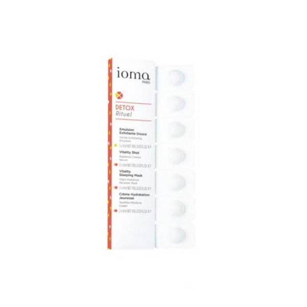 Les 7 mono-doses de soin se glissent dans tous les sacs, se mettent dans toutes les poches. Voyager en beauté devient si facile avec IOMA. TABS Detox Rituel 7x1ml : - 1 dose Emulsion Exfoliante Douce - 2 doses Vitality Shot - 2 doses Vitality Sleeping Mask - 2 doses Crème Hydratation Jeunesse
