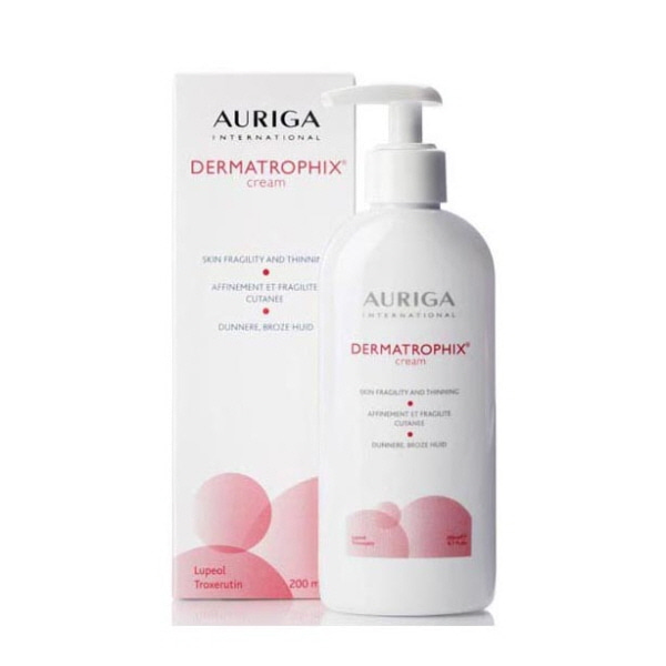 Renforce les peaux fragilisées et affinées Epaissit la peau Restaure la souplesse et l’élasticité de la peau Améliore la résistance de la peau Limite la formation de taches et de bleus au moindre choc Agit sur l’héliodermie du buste. Grâce à l’effet synergique de ses différents constituants, Dermatrophix®cream va agir sur chacune des causes de l’installation progressive de la dermatoporose. Cette dernière se manifeste principalement par une fragilité de la peau associée à un ensemble de symptômes : une peau fine et plissée, d’apparence jaunâtre voire transparente, la formation de petites lésions cicatricielles (cicatrices pseudo-stellaires), une fragilisation des vaisseaux et la formation de bleus au moindre choc. Ces symptômes apparaissent principalement sur les bras, les jambes, les mains mais également sur le décolleté (héliodermie du buste). Dermatrophix® cream va prévenir et agir contre l’ensemble de ces signes visibles, qui peuvent apparaitre avec l’âge ou lors de certains traitements médicamenteux (corticoïdes), garantissant ainsi une amélioration de l’apparence et de la résistance de la peau.