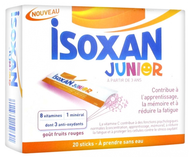 Votre enfant/jeune adulte est fatigué en rentrant de l’école ?Votre enfant rencontre des difficultés de concentration ?L’hiver approche et vous souhaitez maintenir les défenses immunitaires de votre enfant ?___________________________________________________*ISOXAN® Junior contient :Des vitamines B2, B3, B5, B6, B9, B12 et C qui contribuent à réduire la fatigueDes vitamines B1, B3, B6, B9, B12 et C qui contribuent à des fonctions psychologiques normales, du zinc qui contribue à une fonction cognitive normale (concentration, apprentissage, mémoire)De la vitamine B5 qui contribue à des performances intellectuelles normalesDes vitamines B6, B9, B12, C, et du zinc qui contribuent au fonctionnement normal du système immunitaireISOXAN® Junior contient du sucre, des édulcorants, de la lécithine de soja et une consommation excessive peut avoir des effets laxatifs.