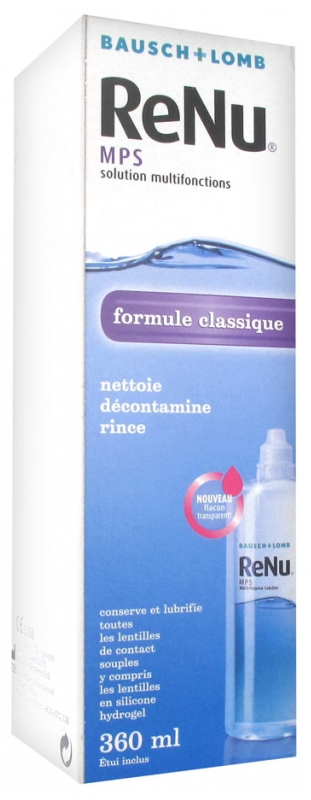 ReNu MPS Solution Multifonctions formule classique nettoie, décontamine et rince. Elle permet de conserver et lubrifier les lentilles de contact souples, y compris celles en silicone hydrogel. Nouveau flacon transparent, étui à lentilles inclus.